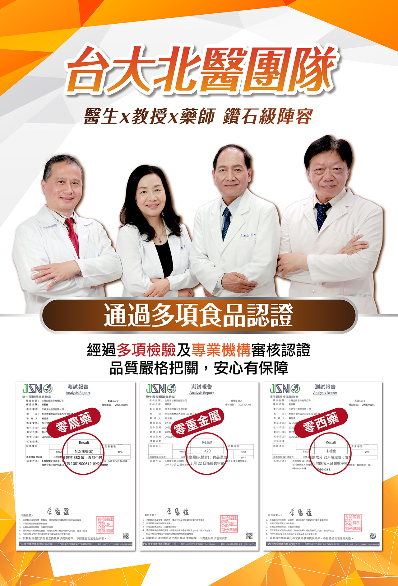 本產品檢驗合格不含農藥、重金屬、防腐劑、西藥(抗生素、類固醇、止痛劑 等)及任何添加物,敬請安心服用。